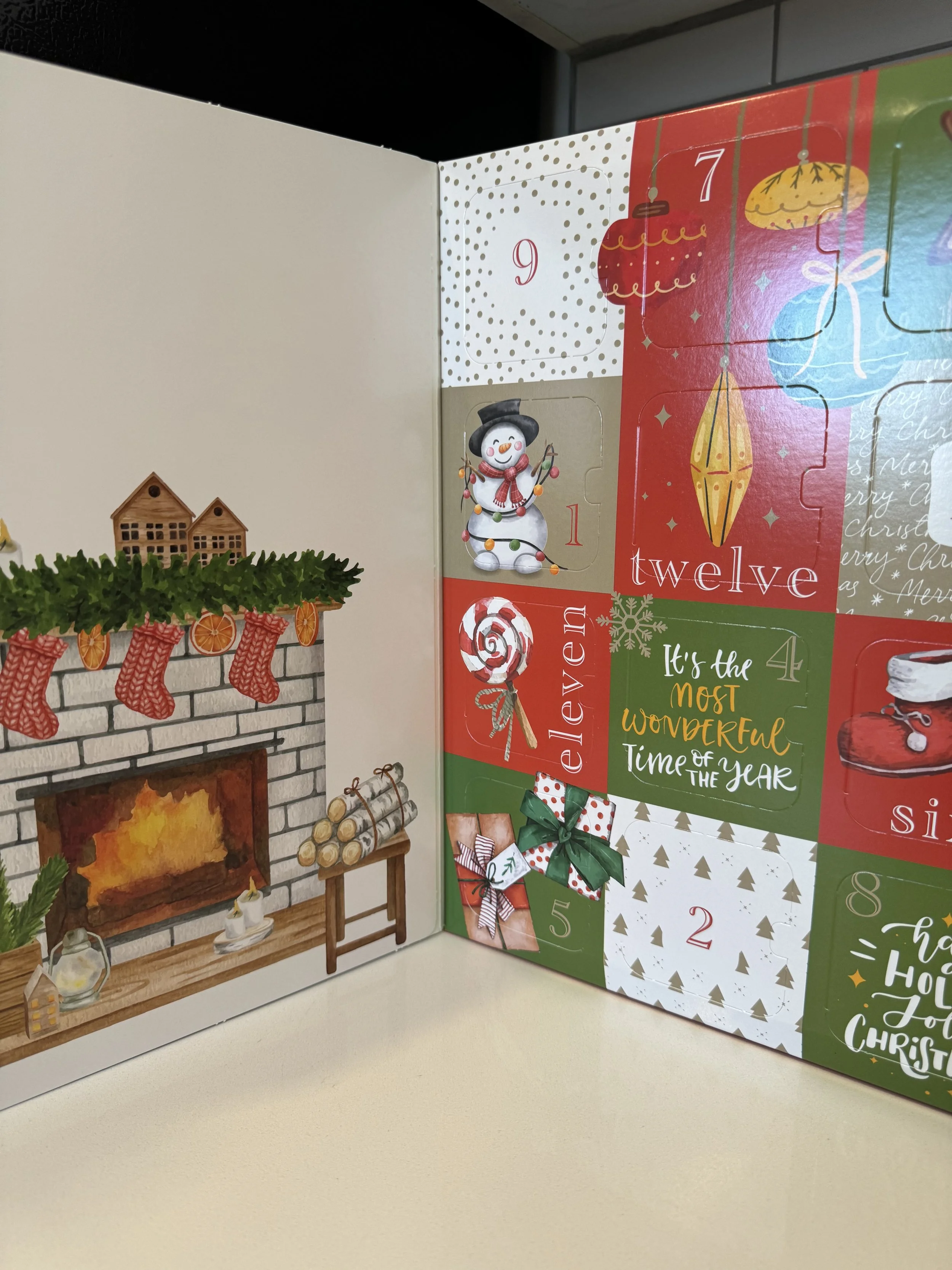 This 12 Day Countdown calendar is illustrated in a traditional style in mostly red and gold. Each calendar has 12 individually wrapped cookies, and one cookie per calendar can be customized with a name.