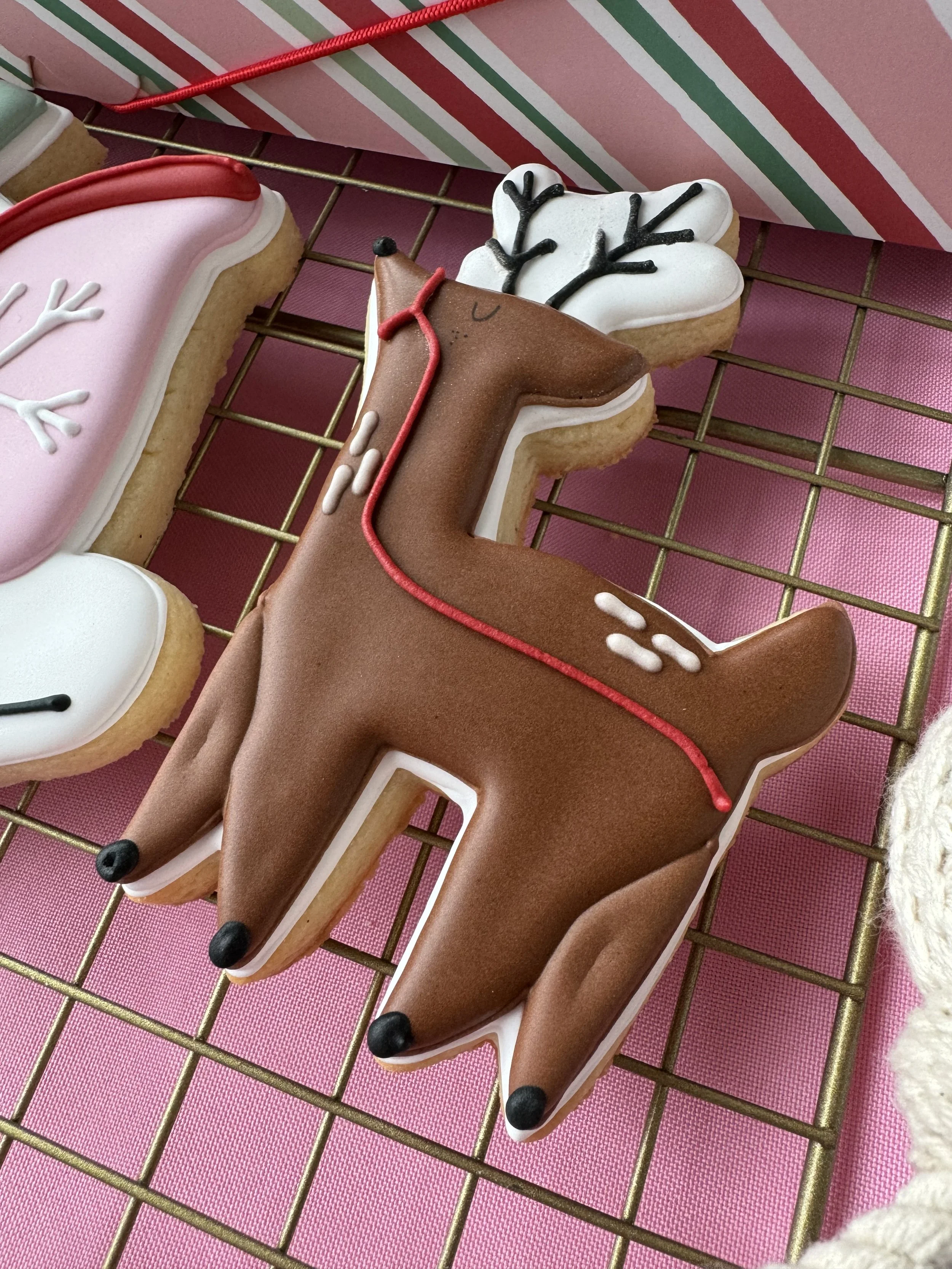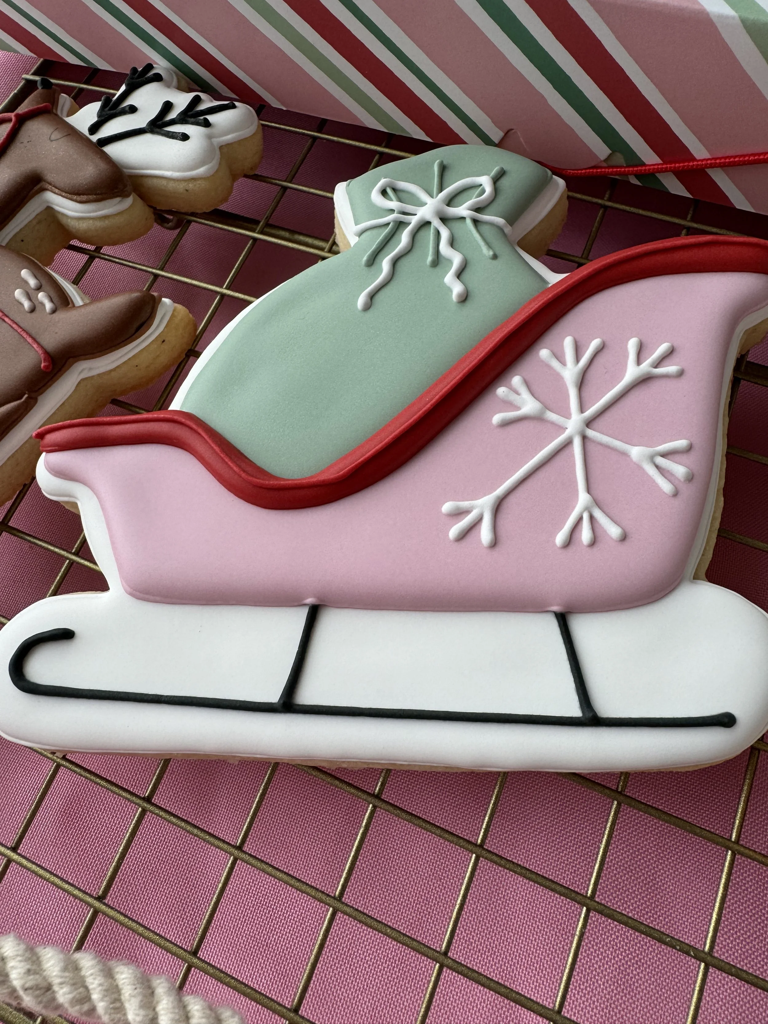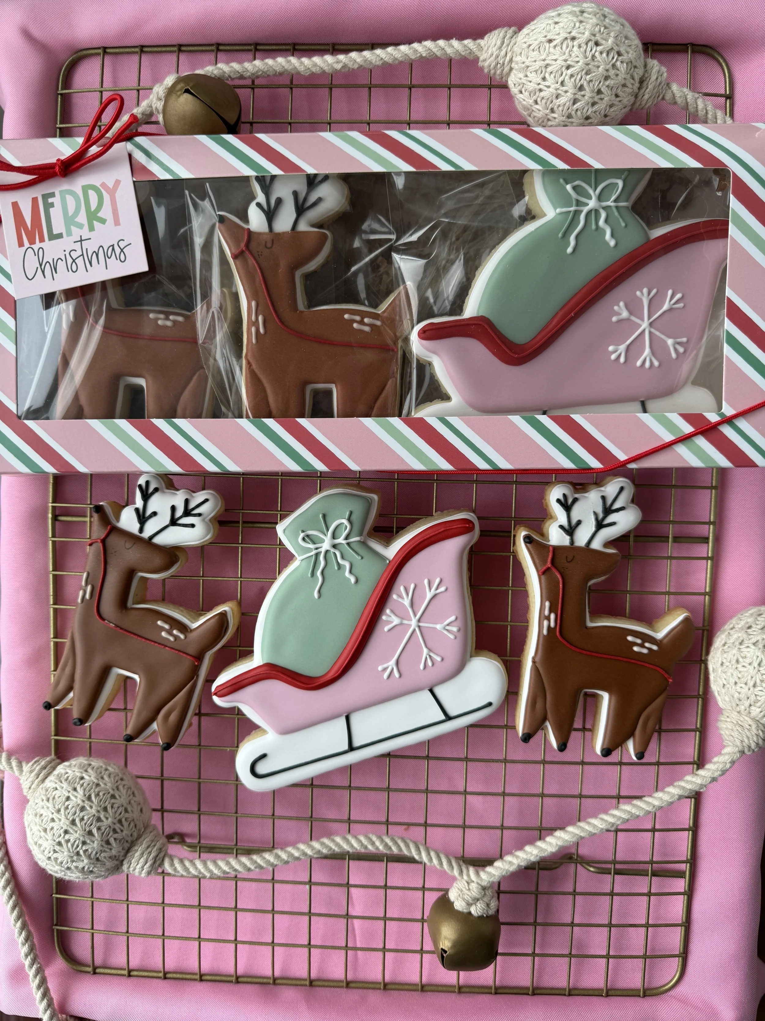 This box of 3 large cookies comes with a very large sleigh and two reindeer. Each cookie is packaged individually and comes in this adorable candy striped box, and a tag and stretch loop.